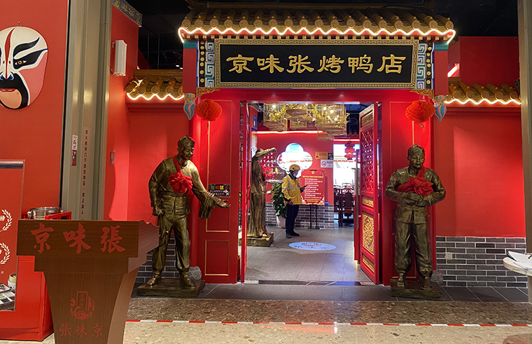 京味張烤鴨店,門店面積約在750-850平方之間,我們首先要滿足餐廳日常運營功能要求。確保餐廳的服務、客流動線流暢不沖突,出餐送餐回收距離最合理。經過10多家門店的運營經驗總結后,我們打破將廚房布置在餐廳側邊或者某個角落的常規布局,開創性將廚房布置在整個餐廳的中間,采用明檔烤鴨房,讓顧客看得見,更好的表達出京味張北京烤鴨的地道特色。同時服務員的出餐送餐回收距離縮短,節省了人力資源,提高了餐廳的利潤水平。