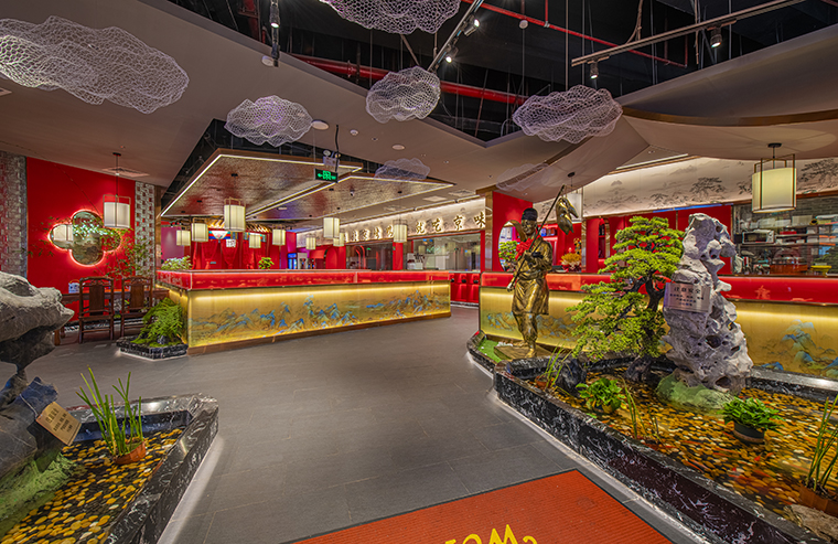 比如品深全案設(shè)計(jì)深度服務(wù)的京味張烤鴨店,在門(mén)店中大量使用中國(guó)紅強(qiáng)化品牌內(nèi)蘊(yùn)的北京故宮皇城文化,令人印象深刻;門(mén)口的迎賓人,提籠遛鳥(niǎo)人,跑堂人等雕塑銅人將老北京烤鴨飲食文化自然帶出,別有情趣;空間墻面中使用大幅北京故宮的高精度畫(huà)面,配上與烤鴨美食相關(guān)的經(jīng)典詩(shī)詞。整個(gè)餐廳的
