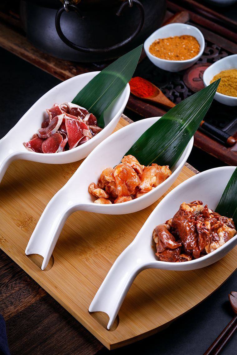 正宗地道的現拌烤肉,堅持選用當天的宰殺的新鮮牛羊肉,現場腌制,現點現腌。現拌烤肉來自于傳統的老北京炙子烤肉,在此基礎上又進行了創新改進。其最大特點是牛、羊、豬肉、小海鮮甚至素菜均需提前加辣椒面、孜然粒、香料粉、香料油、山胡椒油、大蒜、洋蔥等料拌勻后上桌,經過烤制,調料的滋味隨著溫度升高逐漸滲入原料中,烤好的食材無須蘸食料碟,滋味便足夠濃郁。同時最大程度保留了食材的新鮮,比傳統韓式烤肉更加鮮美,好吃!