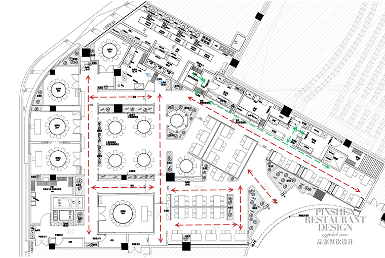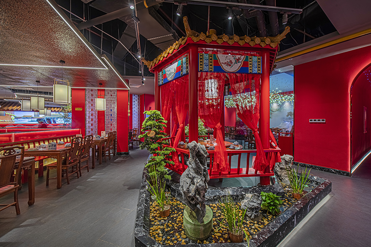 1、本項目為京味張東莞大朗碧桂園里悅里店,總面積約829平方米。用中國紅強化品牌內含的北京皇城文化,令人印象鮮明;