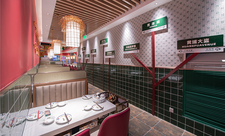 將廣州西關(guān)熱鬧的街市、老廣州人提籠遛鳥的生活方式、令人向往的西關(guān)大屋,有濃烈廣州氣息的廣式花窗,廣式青磚引入空間設(shè)計(jì)中。青磚石墻、廣式花窗、店招門牌、路牌指引、飲茶的風(fēng)俗習(xí)慣等元素地道純正植入到整個(gè)門店氛圍中,一下子驚艷了上海灘。